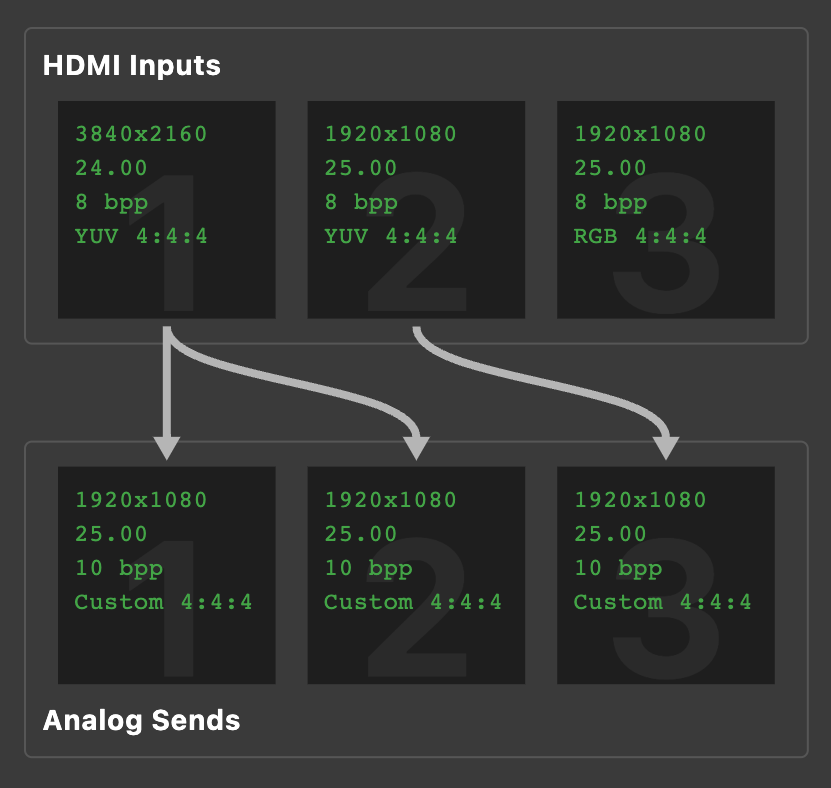 - Three independent sends. Any HDMI input, routed to any of the 3 analog outputs at 30 bits per pixel, each mirrored as HDMI sends.